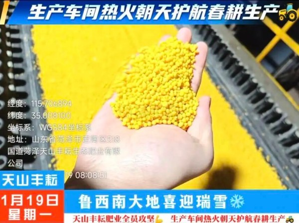 1 月 19 日,一场瑞雪突降鲁西南大地,气温骤降。面对突如其来的风雪天气,天山丰耘生态化肥有限公司迅速启动应急生产预案,全体员工闻令而动、顶风冒雪坚守岗位,以 “保春耕、稳供应” 为核心目标,全力保障生产高效运转,用实际行动诠释了农资人的责任与担当。