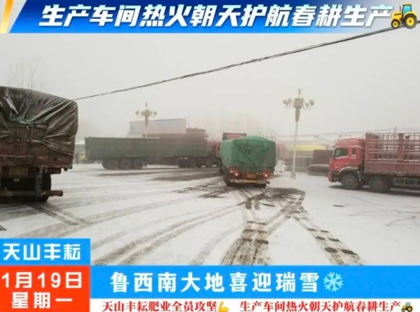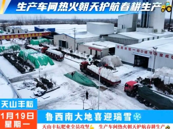 1 月 19 日,一场瑞雪突降鲁西南大地,气温骤降。面对突如其来的风雪天气,天山丰耘生态化肥有限公司迅速启动应急生产预案,全体员工闻令而动、顶风冒雪坚守岗位,以 “保春耕、稳供应” 为核心目标,全力保障生产高效运转,用实际行动诠释了农资人的责任与担当。