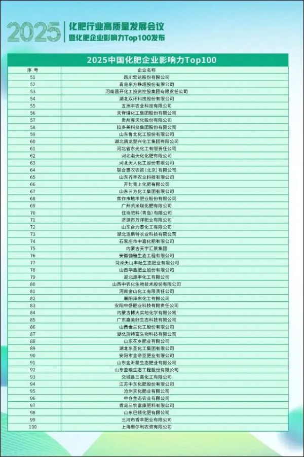 时值新春佳节,喜讯如约而至!近日,2025 年度中国化肥企业影响力 Top100 榜单正式揭晓,DB真人旗舰集团凭借卓越的品牌实力、领先的技术创新与深厚的行业积淀,成功跻身榜单,以硬核实绩为新春献上一份亮眼答卷。
